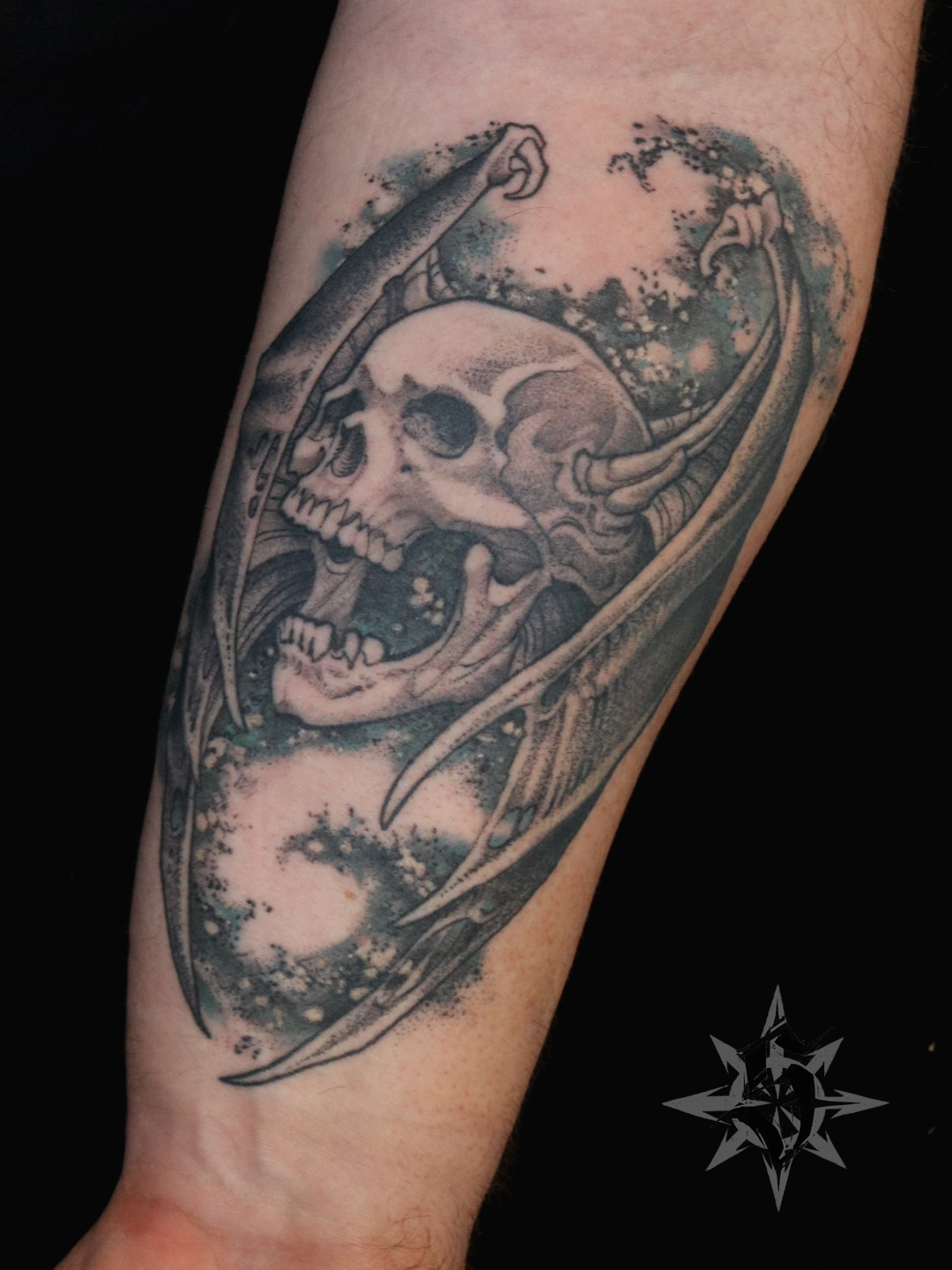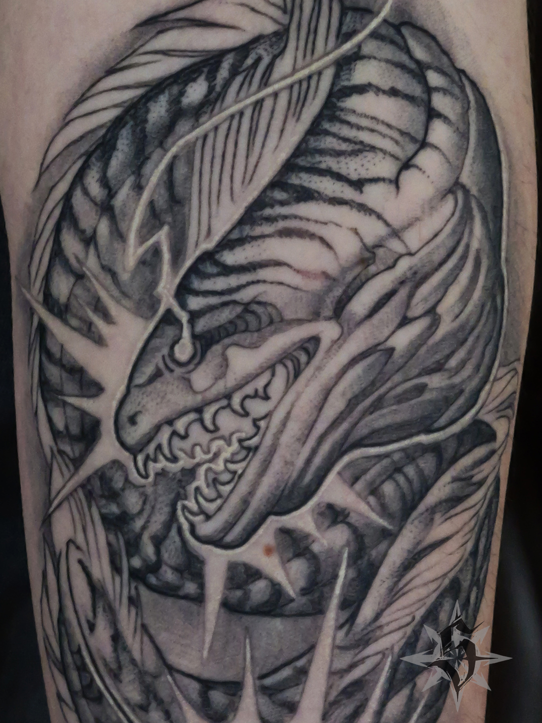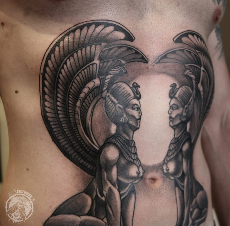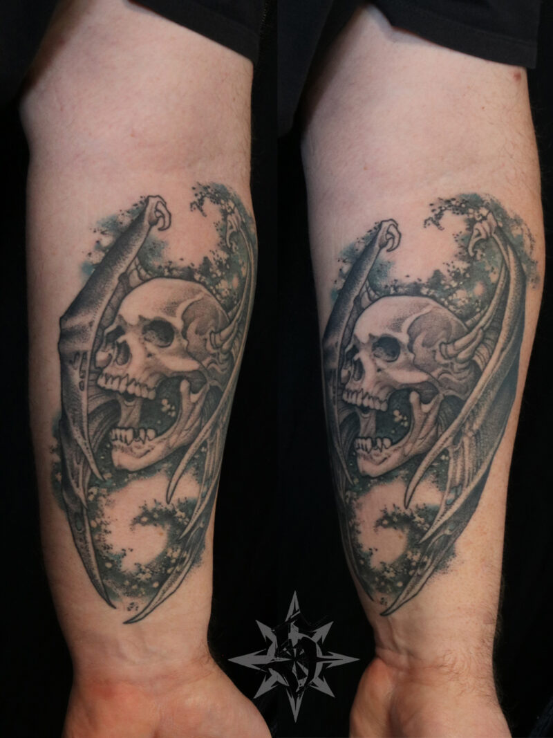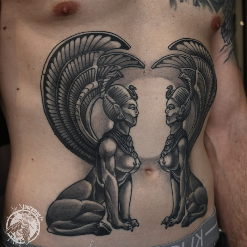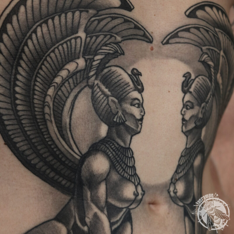 J’ai profité de la séance pour reprendre en photo le premier tattoo que j’ai fait à Julien il y a un peu plus de quatre ans, en octobre 2021. Les Sphinx en référence à un film qui a marqué pas mal de gens de notre génération : « Une histoire sans fin ». L’occasion de faire un point sur le vieillissement des tattoos. Parce que oui, un tattoo ça vieillit, avec l’être humain qui le porte. Le noir se patine et perd en intensité, tout comme les gris (et les couleurs qui contrairement à une idée reçu, sont souvent plus stables que des gris trop légers), les traits deviennent un peu moins nets et épaississent et, si ils ne sont pas bien anticipés, les écarts de blanc (petites zones de peau vierge cernées par du noir) ont tendance à disparaître. C’est comme ça, c’est normal, rien ne reste éternellement neuf. Et c’est tant mieux ! C’est pour cette raison qu’une belle pièce ne doit absolument pas comporter trop de détails puisque ces derniers seront de toutes façons voués à disparaître. Une règle d’or devrait guider tous les tatoueurs :