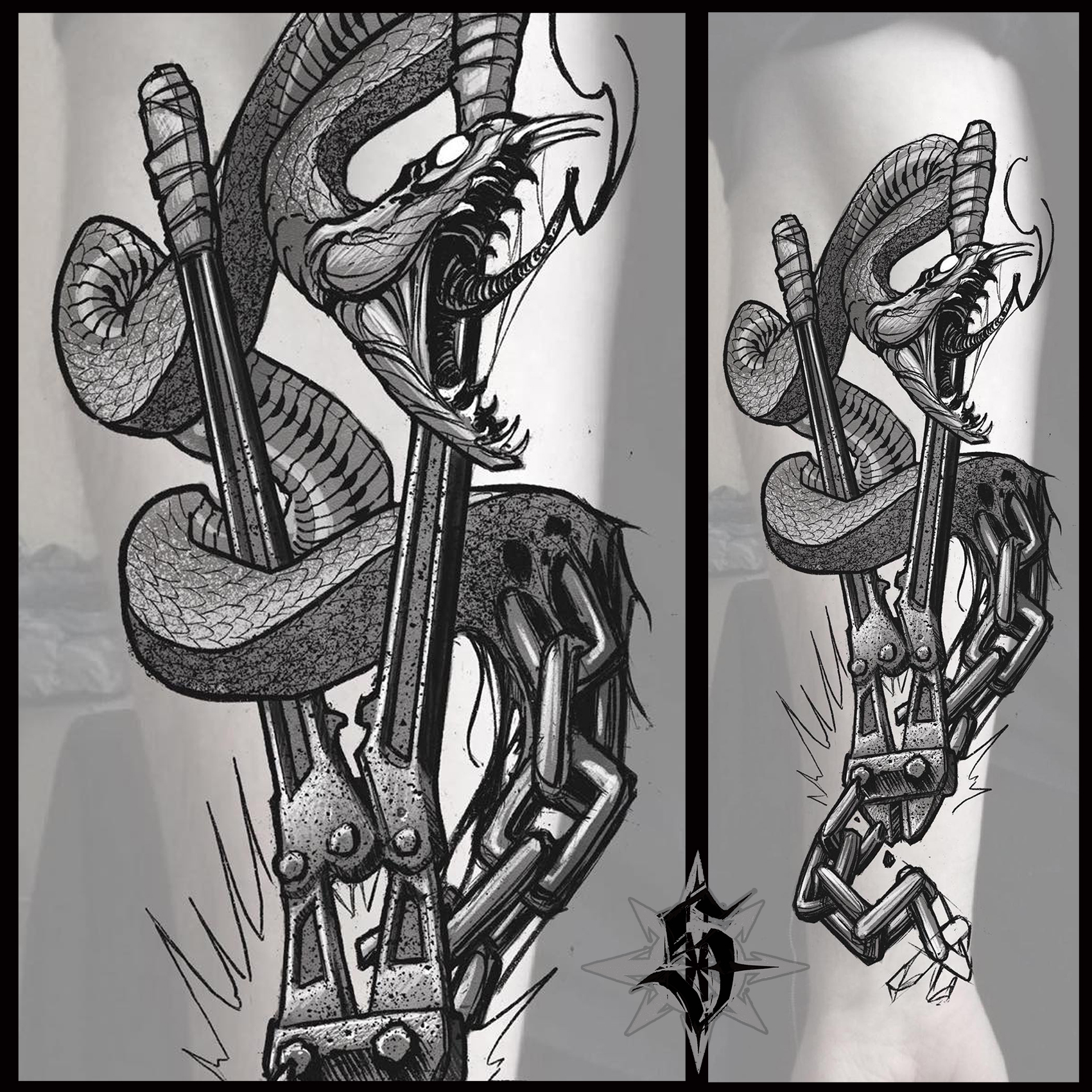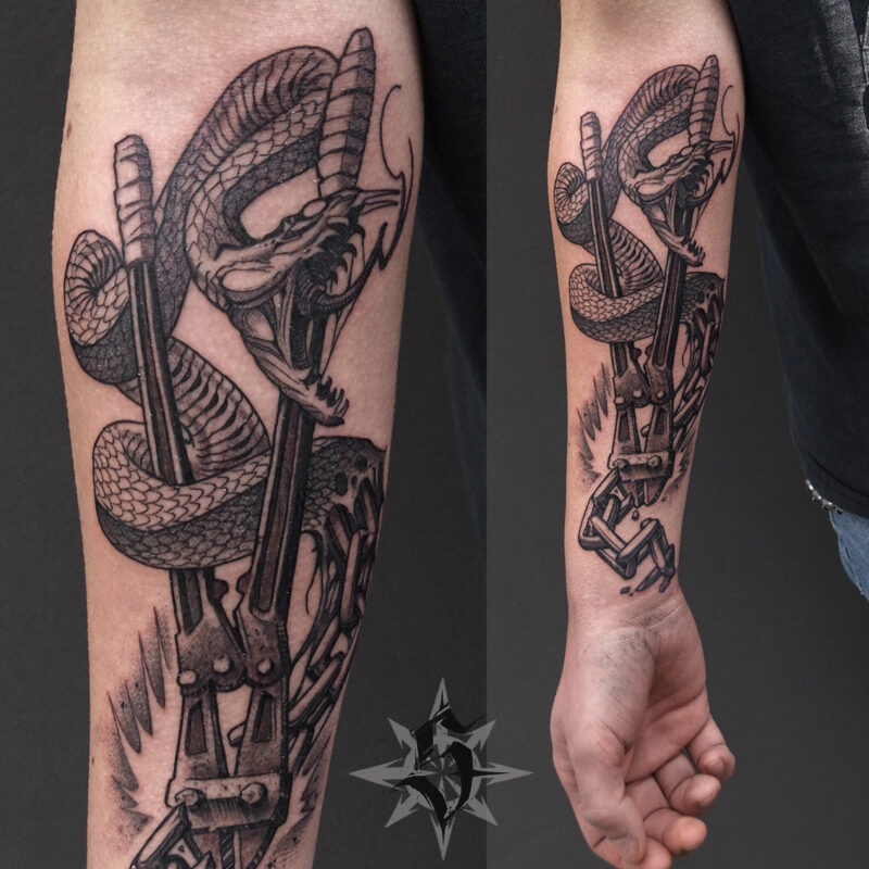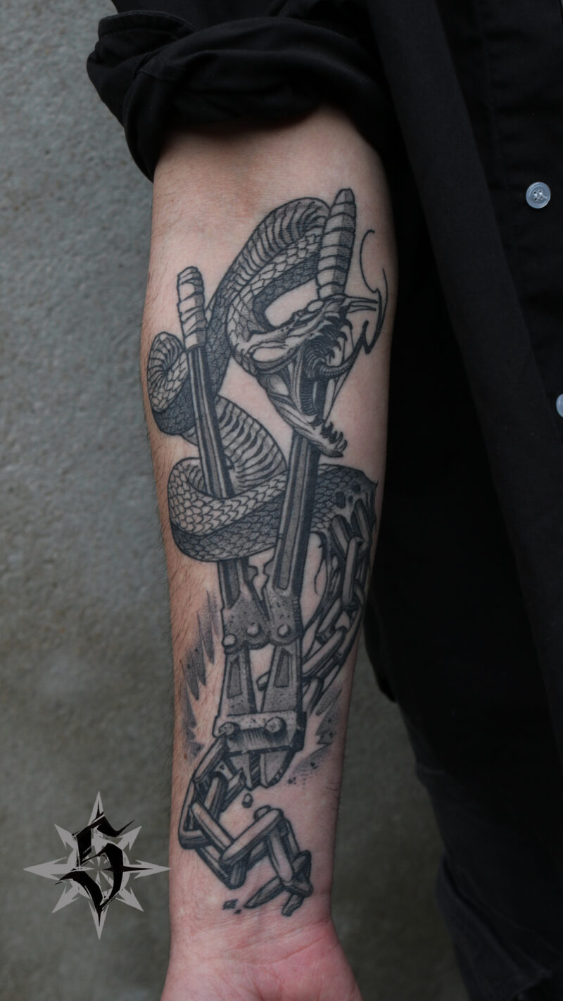 Il y a deux ans je lui avais déjà fait l’autre intérieur d’avant bras en guest chez Mon pote Hugo (encore lui) à Montluçon. Un serpent qui se transforme en chaîne coupée par un coupe-boulon.