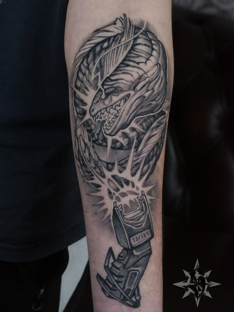 En cherchant un titre pour ce post je me suis rappelé le morceau « Enter The Dragon » du groupe punk londonien Inner Terrestrials et puis en faisant une recherche j’ai découvert qu’il s’agit aussi du titre original du film Opération Dragon avec Bruce Lee pour héro. Bref, du punk et du karaté ça n’a pas grand chose à voir avec le sujet de ce post mais ça vous donne une petite idée du bordel qui s’agite en permanence dans ma tête. Pour en revenir à nos moutons, ou nos dragons en l’occurrence, j’ai avancé sur le bras de Greg hier (la photo du dessus). On s’approche tranquillement de la fin du projet attaqué il y a un an environ. Il serait sans doute déjà terminé si je n’avais pas fait ma petite pause de quatre mois pour partir en trek cet été. Heureusement Greg est patient. Et il a raison, Greg, parce que si il y a bien une qualité essentielle tant pour le tatoué que pour le tatoueur quand on se lance dans une grosse pièce, c’est la patience.