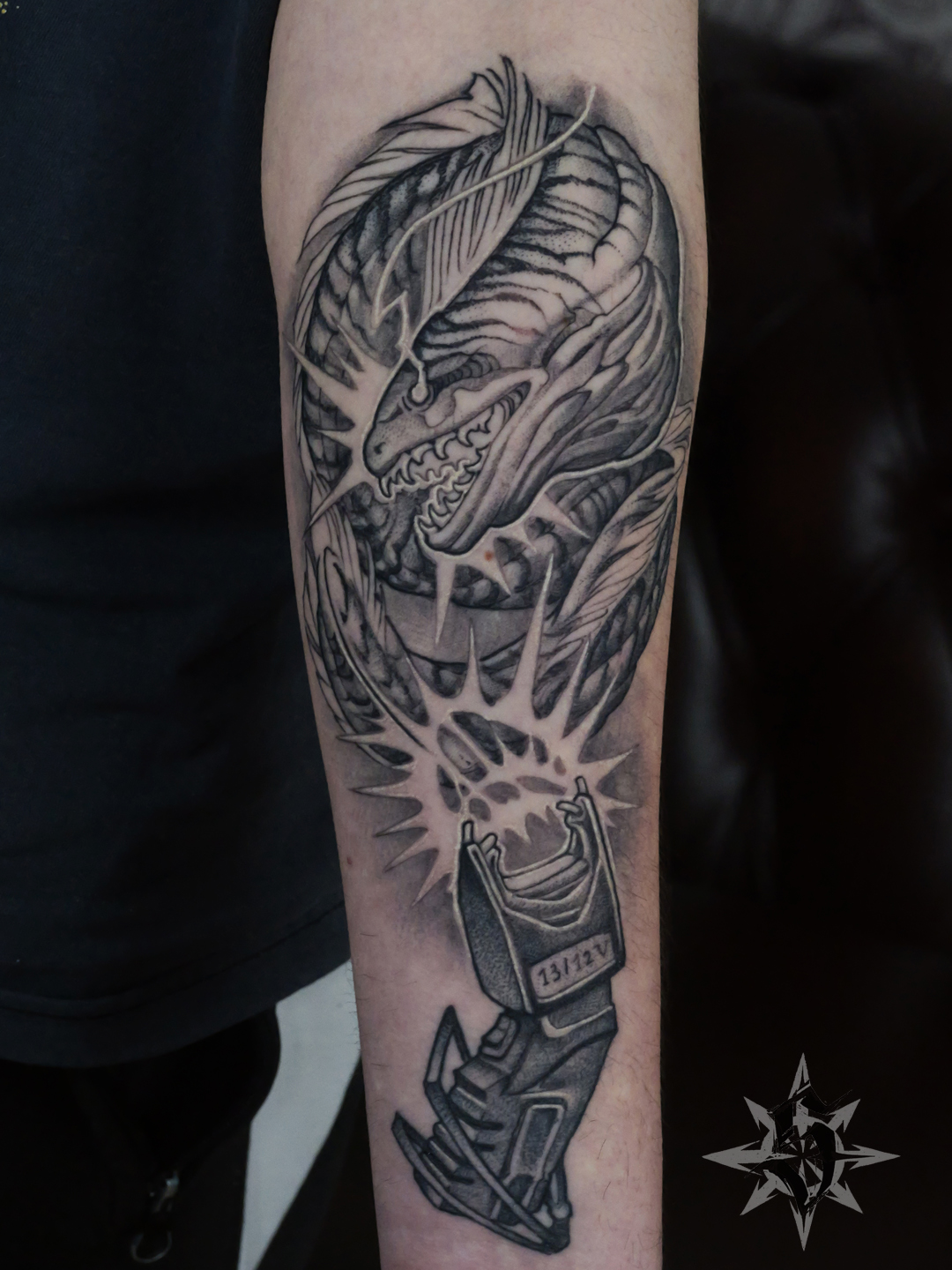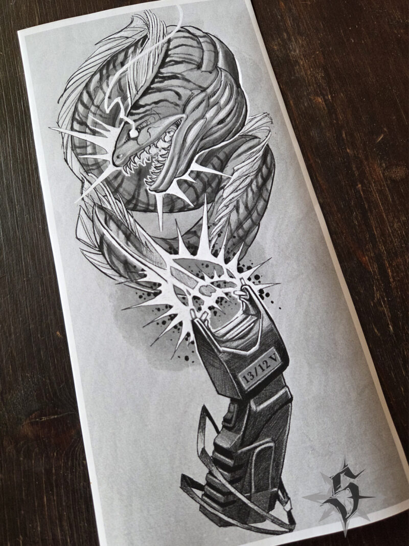 Un des dernier tattoo de 2025, et déjà cicatrisé, la « Murène électrique » de Max AKA Le Zoav. Max a toujours des idées super originales ! Des idées qui me surprennent et me font dire » Ha ouais ! Quand même… Et ben ça va être fun à traiter ça ! » (Merci Hugo de « Rite tattoo » pour la photo).