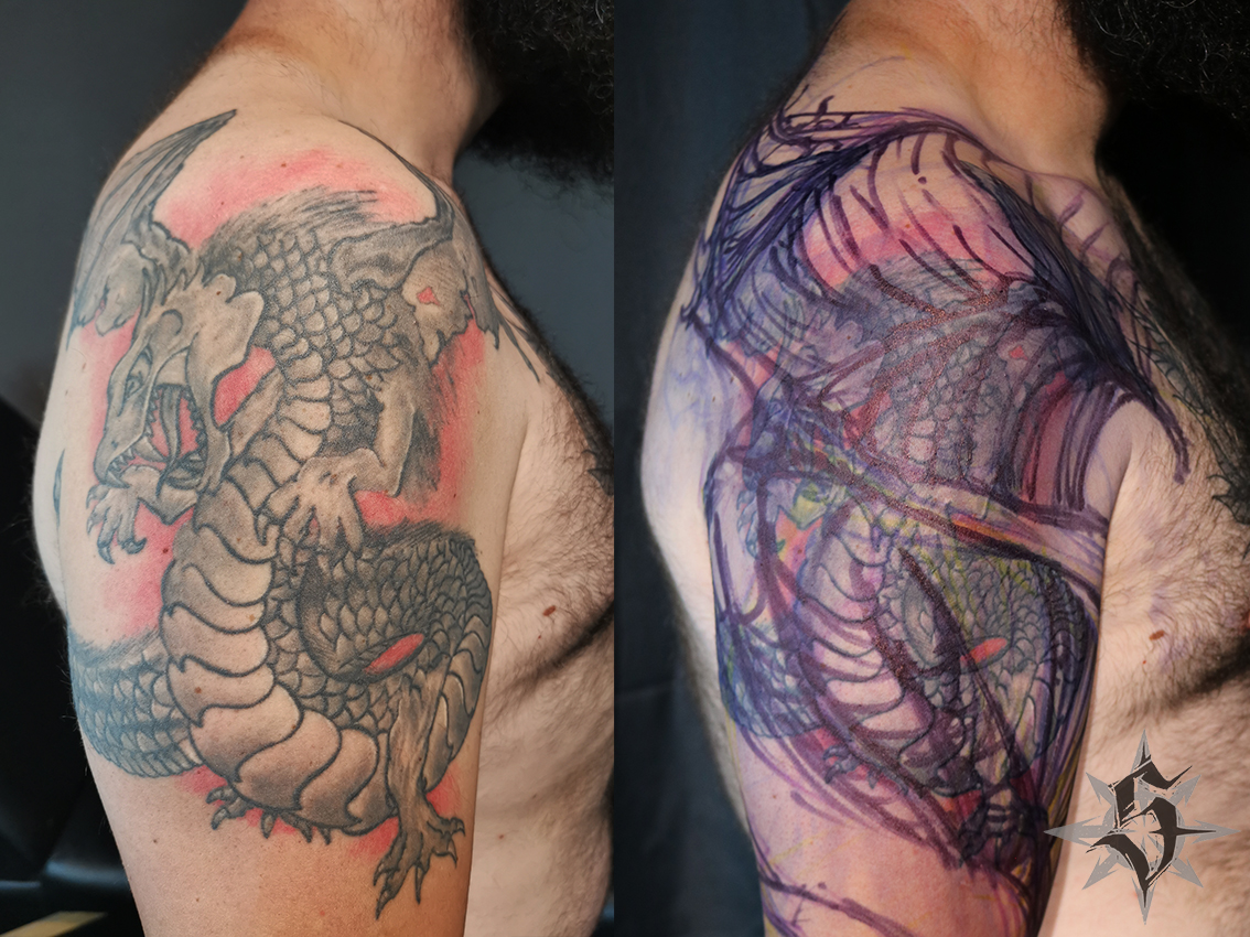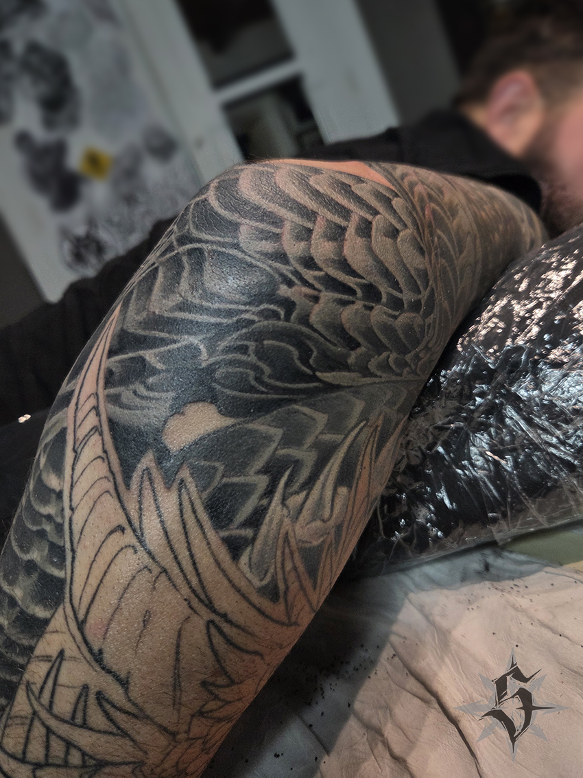 En cherchant un titre pour ce post je me suis rappelé le morceau « Enter The Dragon » du groupe punk londonien Inner Terrestrials et puis en faisant une recherche j’ai découvert qu’il s’agit aussi du titre original du film Opération Dragon avec Bruce Lee pour héro. Bref, du punk et du karaté ça n’a pas grand chose à voir avec le sujet de ce post mais ça vous donne une petite idée du bordel qui s’agite en permanence dans ma tête. Pour en revenir à nos moutons, ou nos dragons en l’occurrence, j’ai avancé sur le bras de Greg hier (la photo du dessus). On s’approche tranquillement de la fin du projet attaqué il y a un an environ. Il serait sans doute déjà terminé si je n’avais pas fait ma petite pause de quatre mois pour partir en trek cet été. Heureusement Greg est patient. Et il a raison, Greg, parce que si il y a bien une qualité essentielle tant pour le tatoué que pour le tatoueur quand on se lance dans une grosse pièce, c’est la patience.