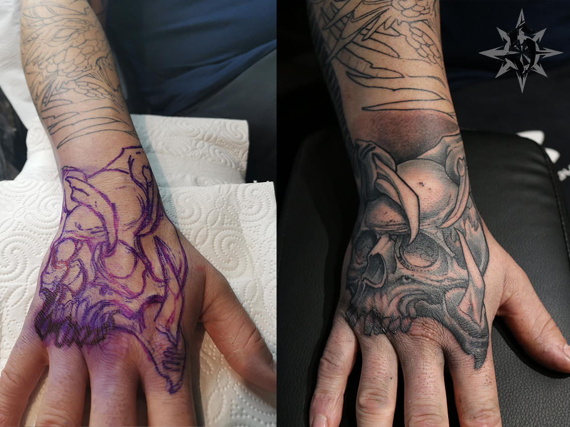 J’en profite pour expliquer un peu mon process pour la mise en place d’un bras. Après avoir pris le temps de discuter du sujet, du rendu souhaité, du temps de travail et de l’implication que ça va représenter; je prends une demie journée pour dessiner directement sur la personne (du freehand quoi…). Je garde une « empreinte » de ce premier jet et je dessine sur cette base le projet final. La première séance a lieu en général un mois plus tard. Le dessin étant sur mesure et complètement adapté à la morphologie de la personne il n’y a aucune surprise lors de la pose du carbone.